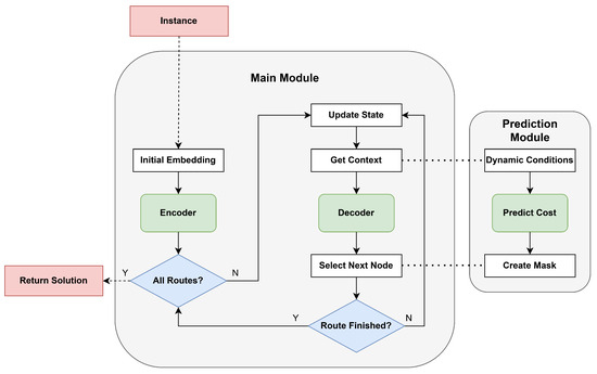Once the feasibility mask is built, the model computes a probability distribution over the feasible nodes using a learned attention-based scoring mechanism. This mechanism outputs log-probabilities for each candidate, and the next node is selected either by sampling from the distribution or by selecting the highest-probability option. This is repeated iteratively at each timestep until the episode terminates, which occurs when all vehicles have reached the final depot. It is important to note that in Section 6, a deterministic variant of the model will be evaluated. This variant shares the same architecture and follows the same process described above, but it ignores the dynamic conditions of the problem when generating decisions. For instance, when constructing the feasibility mask, it does not account for increased travel costs due to dynamic factors, and therefore, the prediction module is omitted entirely. To generate a solution from the model’s output, which is a probability distribution over the candidate nodes at each decision step, three decoding strategies are considered: