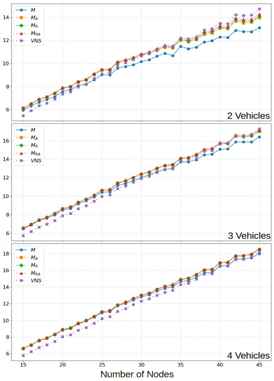 This section presents a discussion of the results obtained when solving the deterministic version of the problem. Five models were evaluated in total: (i) base model (M); (ii) model with reflection-based augmentation (); (iii) model with rotation-based augmentation (); (iv) model with both reflection and rotation-based augmentation (); and (v) the aforementioned VNS approach. Table 1 shows a comparison of the average objective function value of the different models across varying numbers of vehicles. Additionally, Figure 4 presents a comparison of the results based on the number of nodes, grouped by the number of vehicles. These plots help illustrate how each model scales with problem size and whether performance deteriorates or improves with increasing complexity.