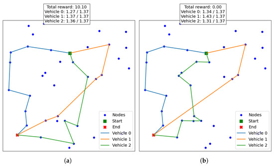 To solve the dynamic version of the problem, a version of the different models was trained to be able to handle these dynamic conditions. In this case, five models were evaluated in total: (i) base deterministic model (M); (ii) base dynamic model (); (iii) dynamic model with reflection-based augmentation (); (iv) dynamic model with rotation-based augmentation (); and (v) dynamic model with both reflection and rotation-based augmentation (). Table 2 shows a comparison of the average performance of the different models for varying numbers of vehicles in the dynamic scenario. The first model (M) performs significantly worse than the others because many of the solutions it produces violate the maximum distance allowed per vehicle, resulting in a zero reward for those instances. Since this model is deterministic and does not account for dynamic changes, it struggles to find feasible solutions in many cases. Additionally, as the number of vehicles increases, the frequency of these violations—and consequently the model’s poor performance—increases, which explains the worsening results with more vehicles. In contrast, the dynamic models are better equipped to handle such constraints dynamically, leading to consistently competitive results with a zero failure rate across all tested scenarios. In fact, their performance closely matches that of the deterministic case, demonstrating the effectiveness of these models in solving the problems while successfully handling dynamic conditions.