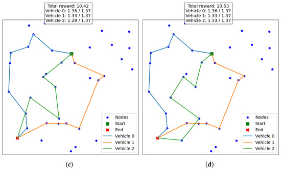In Figure 6, the solutions provided by four dynamic models in the dynamic scenario are compared. Figure 6a,b show the results obtained by the base dynamic model () and the version trained with reflection-based augmentation (), respectively, while Figure 6c,d display the outcomes of the rotation-based model () and the model trained with both rotation and reflection (). Each model proposes a different route plan, reflecting its ability to adapt to dynamic travel times and manage the time constraints imposed by the problem. Among the four, the best performance is achieved by and , which produce the same solution. This is consistent with expectations, as combines the benefits of both augmentation strategies and is therefore guaranteed to return solutions at least as good as the best among them. The solution provided by is slightly less effective, while the base model performs the worst in terms of collected reward. A similar pattern is observed in vehicle time utilization: and operate closest to the time limit, reflecting a more efficient use of the available time. They are followed by , with being the most conservative, leaving a larger unused time margin. Notably, as previously discussed, all four models produce feasible solutions that comply with the time constraints, even under dynamic conditions.