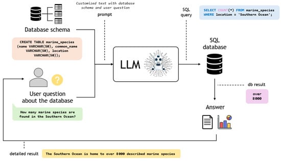 In the domain of natural language processing (NLP), text-to-SQL is defined as the process of translating natural language queries into Structured Query Language (SQL) commands. This facilitates the interaction with databases in the preferred language of the user, avoiding the need to manually enter SQL queries. As Mohammadjafari et al. [1] discuss, the objective is to eliminate the necessity of SQL proficiency to access databases. This task is crucial in the democratization of data access, as it facilitates the translation of human language into machine-readable query formats [2,3]. The workflow of a typical text-to-SQL conversion system consists of three main steps (see Figure 1). Initially, a user asks a question in natural language regarding the contents of a database. Secondly, an artificial intelligence (AI) model is employed to translate this question into an SQL query, taking into account the database schema. Finally, the SQL query that has been generated is executed on the database to obtain the desired result. Moreover, the implementation of multi-conversation memory and error-correction techniques has the potential to enhance this process [4,5,6].