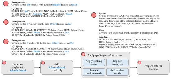 The data used for this study was based on a customized set of actual diagnostic and telemetry information from a fleet of connected vehicles stored in an SQL database. Then, multiple pairs of natural language Spanish queries were generated with their corresponding SQL Server queries, which were executed on a real database to extract the requested information. In total, the data used for this study has 250 training and validation samples and 50 samples for the final evaluation on a real server. The augmentation of the training set was also implemented to enhance the robustness of the model. In summary, the dataset under consideration contains 300 raw samples that were manually labelled. Some examples of the custom text-to-SQL database are provided in Table 2.