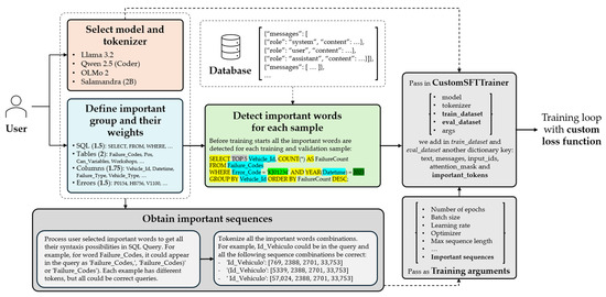Furthermore, custom weightings were used to highlight important token sequences, regardless of where they are in the predicted SQL query. Unlike a cross-entropy with token-level weights [42], our work extrapolates it to the level of token sequences. This approach leverages the commutative nature of certain SQL constructs, such as logical conjunctions or condition order, ensuring that semantically equivalent but syntactically varied queries are not unfairly penalized. The following 9 groups were weighed during the custom training of the LLM for our custom text-to-SQL task: tables, columns, vehicle identifiers, errors, workshops, vehicle type, vehicle group, vehicle model and vehicle body. The weight attributed to each group was determined by the importance it is considered to have by the user. The pipeline used to detect important sequences is illustrated in Figure 3.