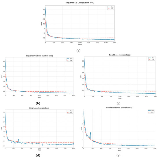 As described in Section 2, the proposed loss function integrates four components: sequence-matching cross-entropy loss (), focal loss (), F-beta loss (), and contrastive sequence loss () according to Equation (10):