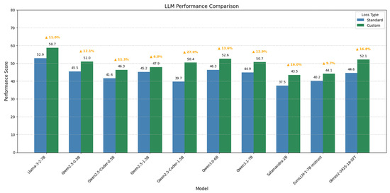 In summary, the proposed dynamic custom loss function significantly outperforms the standard loss function across multiple open-source models for the text-to-SQL task. By dynamically adjusting loss weights, the model effectively learns to prioritize critical aspects of SQL query generation, resulting in higher execution accuracy and robustness, particularly for complex and domain-specific queries. These findings underscore the potential of tailored loss functions in enhancing LLM performance for structured prediction tasks.