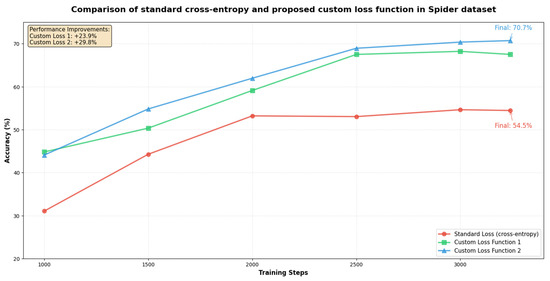 As can be seen in Figure 8, the SQL query accuracy results improve by almost 30% over the standard cross-entropy function. Also, the increase in accuracy can be observed throughout the training, demonstrating the increased performance of the text-to-SQL models thanks to the proposed cost function.