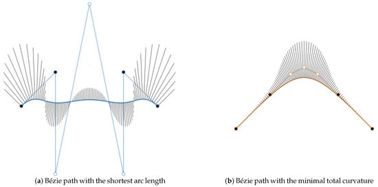 On the other hand, most existing works focus on using a certain feature to model and optimize a UAV path. For example, the Dubins curve is used to design the path with the shortest arc length, while the PH curve is used to construct the path curve with the minimum overall curvature. These modeling methods are prone to results in curves that have very good performance in one aspect but have poor performances in many other aspects. Here, a smooth path planning example based on the Bézie curve is given to illustrate the statement. Here, the start and target point of the UAV are given, and in addition, the control points and are defined to fulfill the velocity and orientation requirements in the UAV flight. As shown in Figure 1a, if the goal is to minimize the arc length of the path, the smoothness of the resulting path is poor (the black straight lines around the curve represent the curvature radius of the curve at the corresponding point), which is not conducive to the stable flight of UAVs. As shown in Figure 1b, if the smoothness of the path achieves the best result, the arc length of the resulting path will be relatively long, increasing the energy consumption and task execution time of the UAVs. Additionally, the curvature radius in the middle part of the curve is relatively large, which may affect the flight stability of the UAV there.