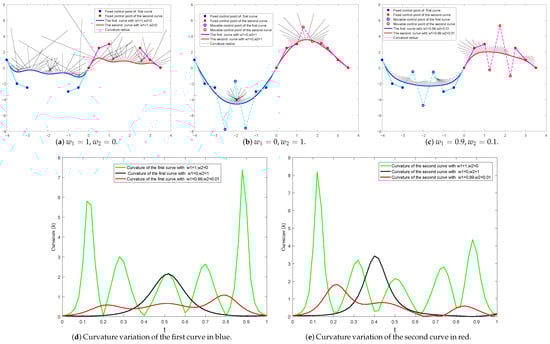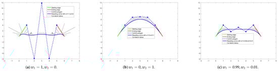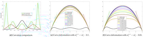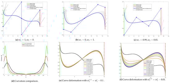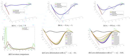 - From Figure 2e, Figure 3e, Figure 4e and Figure 2f, Figure 3f, Figure 4f, it is evident that when and , namely, , the shape of the optimal curve is not sensitive to the value changes of the weight parameters and . As gradually increases and gradually decreases, namely, as gradually decreases, the shape of the curve becomes increasingly sensitive to the changes in the values of the weight parameters and .