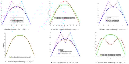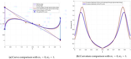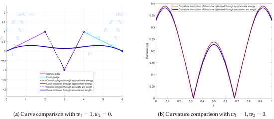 As can be seen from Figure 5, when , namely, only the approximate bending energy is used, the generated curve is longer in arc length and has a greater maximum curvature than the curve obtained using the accurate curvature. When , , the curve generated using the proposed method is basically the same as the curve obtained using the exact curvature. When , the arc length of the curve generated by the proposed method is shorter than that of the curve obtained by using the exact curvature, and the maximum curvature of the curve is also smaller. From Table 1, we can see that the time used in this method is shorter than that used in the comparison method.