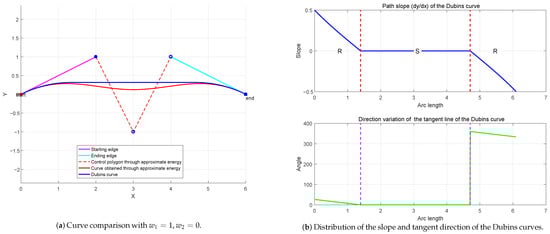 Given the starting and ending point as well as the pose constraints of UAVs such as the motion direction of the UAV in 2D space, one can use a Dubins curve to model a path with the shortest arc length. A Dubins curve consists of a straight line and two circular arcs. Although Dubins curve can be easily constructed with simple geometric elements and the calculation is not complex, the curvature of a Dubins curve is usually not continuous at the junction of the straight line and arc [21,22]. In this case, if a UAV flies along a Dubins curve, the UAV needs to change its control angle sharply, which is difficult to achieve physically with current technologies.