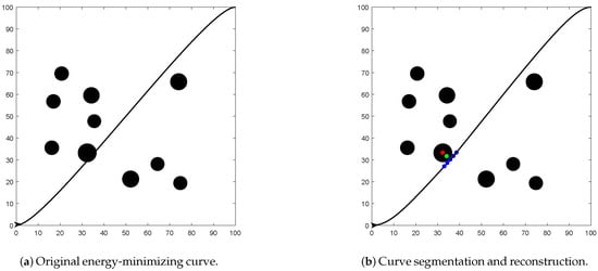 In Figure 6, we present a comparison study to show how well the first-order approximate energy (3) approximated the arc length formula in constructing a curve with the shortest arc length [27]. In addition, the comparison of the numerical results of the proposed method with the method in [27] is shown in Table 2, including the comparison of the max curvature, path length, and computation time. From Figure 6, we can see that when , namely, only the approximate stretching energy is used, the generated curve is basically the same as the curve obtained using the accurate arc length formula; see Figure 6a,b.