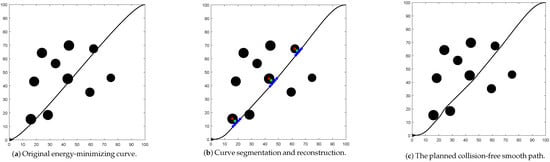 - By contrast, visual analysis of Figure 2c, Figure 3c, Figure 4c and Figure 9c and Figure 2d, Figure 3d, Figure 4d and Figure 9d,e indicates that, on the one hand, optimization based on composite energy can reduce the arc length of path; on the other hand, as can be seen from Figure 3d, Figure 9d and Figure 9e, sometimes the maximum curvature of the curve obtained by optimizing the composite energy is actually smaller than that obtained by optimizing the bending energy only and thus is more conducive to the safe and stable flight of UAVs.