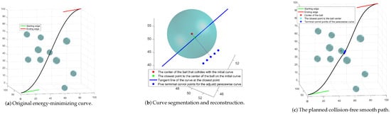 The design of a collision-free smooth path by using multiple energy-minimizing Bézier curves in the scene with another set of obstacles is shown in Figure 11. Analogously, the construction of a collision-free smooth path by using multiple energy-minimizing Bézier curves in 3D space can be achieved.