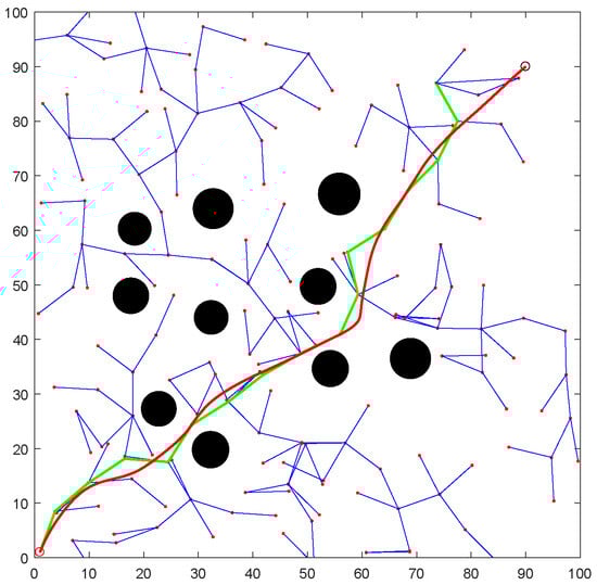 In Figure 13, an example of UAV path planning in a complex environment is presented. In this study, the RRT* algorithm [34] was used for the initial path planning. In the figure, the blue straight line segments indicate the growth process of the random search tree, and the green polyline represents the generated initial path. Then, the proposed method was employed for path smoothing, and the generated smooth curve is represented as the red curve in the figure.