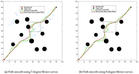In Figure 14, an example is presented to compare the smoothing effects of 7-degree Bézier curves and 8-degree Bézier curves in path smoothing. The discrete initial path in green was obtained by the RRT* algorithm [34], and the red curve in Figure 14a,b represents the smoothed path obtained using the proposed method with 7-degree Bézier curves and 8-degree Bézier curves, respectively. From Figure 14 (especially the paths within the rectangular boxes), it can be seen that using the 8-degree Bézier curves resulted in a better smoothing effect due to its higher degree of freedom. Here, the calculation time for path smoothing using 7-degree Bézier curves and 8-degree Bézier curves was 1.53 s and 1.77 s, respectively.