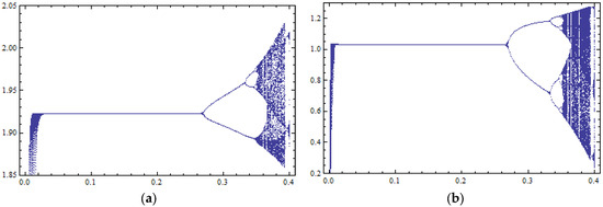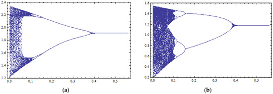 Bifurcation diagrams with respect to the control parameter k (horizontal axis) with 400 iterations of the map of Equation (38) for : (a) against variable ; (b) against variable .