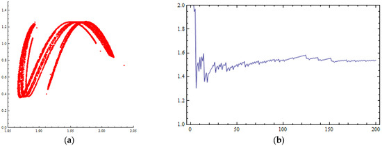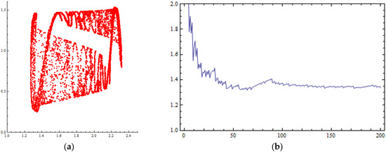 Numerical simulations of the orbit of (0.1, 0.1) of the map of Equation (47) for : (a) phase portrait (chaotic attractor) with 8000 iterations; (b) Lyapunov numbers’ graph.