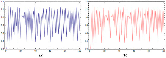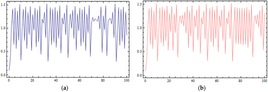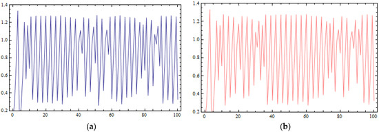 Another indication of the chaotic behavior caused by large values of parameter k is the sensitivity of the D.D.S. of Equation (38) in its initial conditions. In Figure 7a,b, the time series of two different initial conditions, (0.1, 0.1) (Figure 7a) and (0.101, 0.1) (Figure 7b), are plotted. At the first iterations of the time series, choosing the value of it seems that they are identical, but later, differences between them appear.