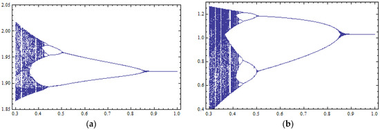 Bifurcation diagrams with respect to the control parameter m (horizontal axis) with 400 iterations of the map of Equation (16) for : (a) against variable ; (b) against variable .
