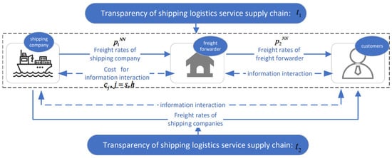 Within the domain of shipping logistics services, the primary entity offering agency services for the shipper is the freight forwarder company. However, with the evolution and progress of shipping companies, a scenario of homogeneous competition has emerged between the shipping company and the freight forwarder. This paper intentionally excludes considerations of cooperative relationships between freight forwarders and shipping companies to underscore the competitive dynamics between these entities. It posits a scenario wherein a competitive relationship prevails between the two entities. The model is streamlined by assuming the market comprises two shipping logistics service supply chains. One is characterized by the freight forwarder acting as the contract carrier, and the other is dominated by the shipping company. Both entities offer agency services. The shipping company wields greater monopoly power within the shipping market [52]. Therefore, this paper posits that the inception and control of the blockchain alliance are attributed to the shipping company. The shipping company cannot compel blockchain adoption, and the freight forwarder retains the discretion to abstain from participation in the blockchain alliance.