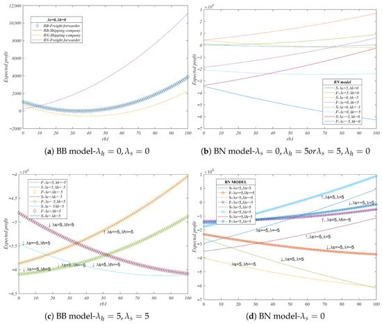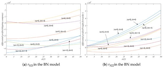 (2) After the implementation of BCT by the service provider, when the service provider adopts a risk-pursuing strategy, the freight rate decreases with an increase in the shipper’s willingness to use BCT. In the BB model, the shipper’s willingness to use BCT exerts a greater impact on the shipping company’s freight rate than on the freight forwarding rate. In contrast, in the BN model, the shipper’s willingness to use BCT has a more pronounced effect on the freight forwarding rate. In the BB model, when the shipper’s willingness is greater, the freight forwarder must significantly avoid risks to enhance its expected profit. The higher the risk the shipping company pursues, the slower the expected profit increases with the shipper’s willingness. In scenarios where competitors pursue high risk, with an increase in the shipper’s willingness, the freight forwarder’s expected profit growth rate in the BN model surpasses the expected profit growth rate in the BB model.