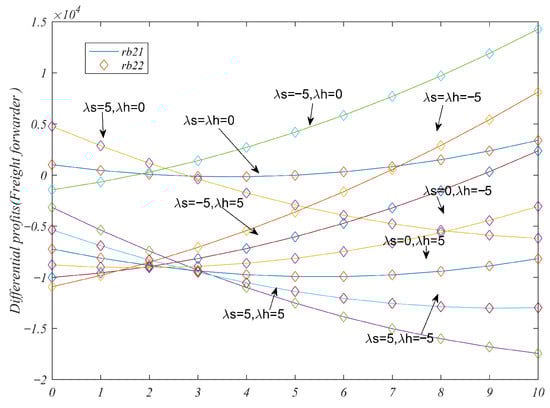 The pricing set by the shipping company surpasses that of the freight forwarder; conversely, the pricing of the shipping company falls below that of the freight forwarder. This observation indicates that when the shipper’s inclination is more pronounced, the pricing by the service provider exceeds that of the competitor. This pronounced inclination is attributable to the heightened willingness of the shipper, resulting in a larger market share for the service provider and increased market demand. Observation shows that the shipper’s inclination is correlated with risk disposition and the transparency of the shipping logistics service supply chain. Moreover, the threshold represented by diminishes with an augmentation in and dwindles with an escalation in .