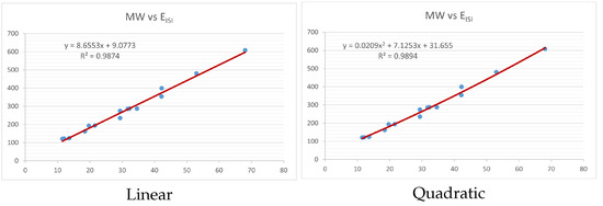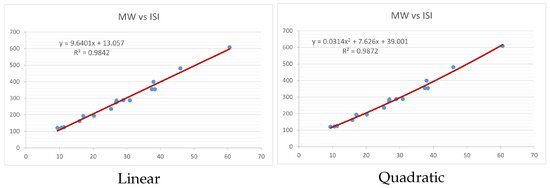 Linear vs. quadratic regression of molar weight (MW) with index.