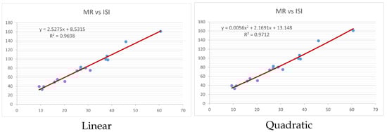 Linear vs. quadratic regression of molar refractivity (MR) with index.