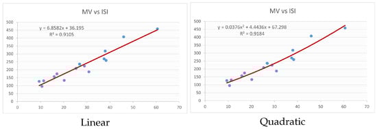 Linear vs. quadratic regression of molar volume (MV) with index.