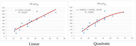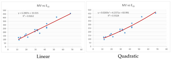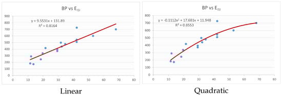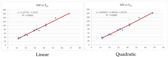 Similarly, the comparison of linear and quadratic regression analysis for the physicochemical properties of the alkaloids against the energy is displayed in Figure 10, Figure 11, Figure 12, Figure 13, Figure 14 and Figure 15. Below are the approximated linear and quadratic regression equations for the physicochemical properties with the energy: