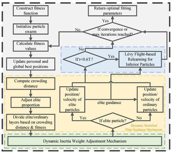 - Dynamic stratified elite guidance: Dynamically divides particles into elite and ordinary layers based on individual fitness and crowding distance, utilizing elite particles’ search experience to guide ordinary particles’ exploration direction.