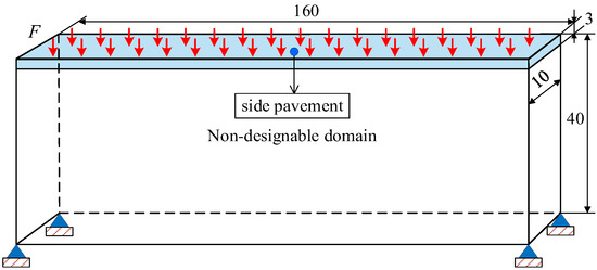 In this section, the computational accuracy and efficiency of PTO and BESO methods are compared through a 3D bridge structure, which is shown in Figure 1. The sizes of the design domain and non-designable domain are 160 × 10 × 37 and 160 × 10 × 3 elements, respectively. The non-designable domain refers to the side pavement. The four vertices at the bottom of the structure are fixed. According to European standards, the load for a pedestrian bridge is 5 kN/m2. Since this design simplifies the model and employs a dimensionless design, a uniform force F = 0.01 N is applied to each unit on the bridge deck. The material used for optimization is an isotropic material. The material usage is taken as 0.3, and the filter radii are set to 2. To discuss the influence of p-norm on the 3D structural design, p takes three cases, such as 2, 3, and 4, in the BESO method. Figure 2 depicts the evolutionary topologies under four cases. Table 1 lists all the numerical results, and Figure 3 depicts the iteration curves under the PTO and BESO methods.
