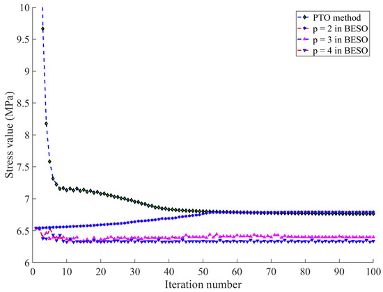 Design variables in BESO are binary, while the PTO design variable is continuous. The objective function defined in Equation (1) is to minimize the maximum stress, which is nondifferentiable. Hence, it cannot be directly used with sensitivity methods. Instead, BESO uses the p-norm to measure von Mises stress during the optimization, whereas PTO does not require a sensitivity analysis. Therefore, the parameter p is not needed to evaluate structural stress. The p-norm stress can be calculated as