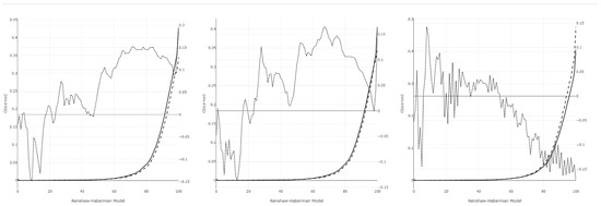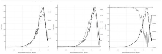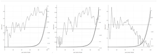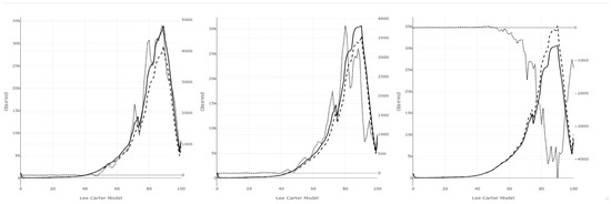 Once the central death rates were obtained, they were incorporated into both the Lee–Carter (LC) model, defined in Equation (2), and the Renshaw–Haberman (RH) model, shown in Equation (3), along with the corresponding population data. Model selection metrics such as AIC or BIC were not applied, as the goal was not predictive accuracy but demographic consistency in the counterfactual baseline. The modelling framework follows the LC2 extension, as described in [13], with central death rates as the dependent variable.