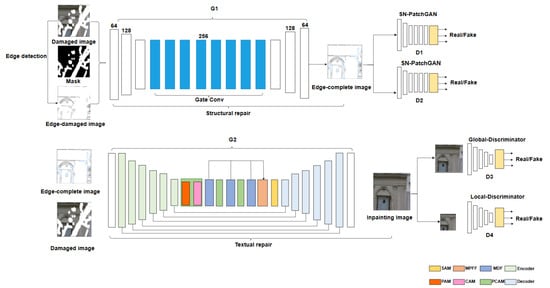 Our network configuration—a hierarchical adversarial network with two specialized generators. Structural restoration: encoder–decoder with multi-scale residual blocks, supervised by a multi-scale discriminator for edge coherence. Texture restoration: attention-augmented skip-connections in the generator, constrained by dual discriminators.