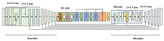 The generator consists of convolutional downsampling blocks, a partial convolutional attention module (PCAM), a multiscale pyramid feature fusion module (MPFF), a self-attention mechanism block, and convolutional upsampling blocks. The downsampling module is made up of convolution layers, normalization layers, and ReLU activation function layers. By stacking multiple convolution layers, the network progressively abstracts and extracts higher-level image features, as illustrated in Figure 4. The input of the convolutional downsampling module is skip-connected with the output of the 3 × 3 convolution, fusing feature maps at different scales. The input of the first convolutional downsampling block is skip-connected with the output of the 1 × 1 convolution of the second block, while the 3 × 3 convolution outputs of the second to sixth downsampling blocks are skip-connected with the 1 × 1 convolution outputs of the previous block. By utilizing multiple 1 × 1 convolution layers, non-linear activation functions are introduced into each convolution layer, enhancing the model’s expressive power and non-linear mapping capabilities.