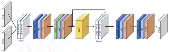 The convolutional upsampling module consists of transposed convolution layers, a self-attention mechanism module, normalization layers, and ReLU activation layers, as shown in Figure 5. It is composed of 1 × 1 convolutions, transposed convolutions, self-attention feature modules, and 3 × 3 convolutions. The network contains six sets of convolutional upsampling modules, corresponding to the convolutional downsampling modules. The input of each upsampling module is a combination of the output from the previous upsampling module and the output of the corresponding 3 × 3 convolution layer from the downsampling module. By skip-connecting the downsampling and upsampling layers, the shallow information lost during feature extraction is restored in the decoding stage, enabling the network to retain more original details.