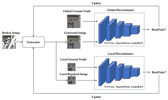 The structure of the texture restoration network’s discriminator is illustrated in Figure 6. The global discriminator evaluates the entire image, calculating the global difference between the generated image and the ground truth, while the local discriminator assesses differences between specific regions of the ground truth and the generated image. Both global and local discriminators [] extract high-level semantic features from input images through downsampling operations, computing the corresponding global and local losses. To focus on the repaired areas, pixels in the unbroken regions of both the ground truth and the repaired image are set to zero, leaving only the repaired areas for the local discriminator to process. This approach allows the local discriminator to adapt to training on irregular missing regions.