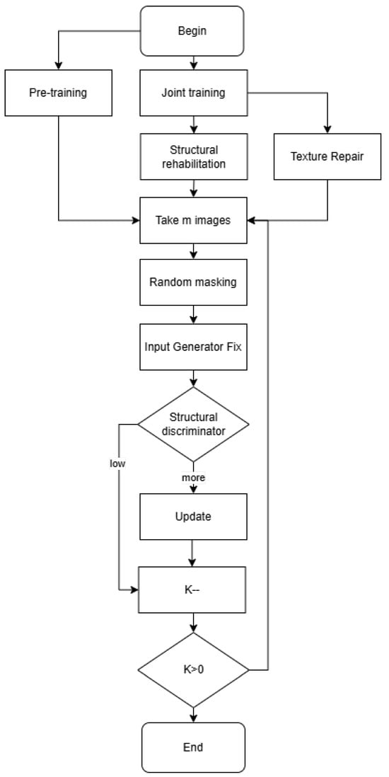 During joint training, the processes for both networks run concurrently; the structure generator and texture generator work together to generate images that the texture discriminator cannot classify as real or fake. The texture discriminator attempts to distinguish between real data samples and generated samples. This alternating training helps each generator focus on its specific repair task, improving the overall performance of the model. This structured approach allows for effective training and collaboration between the networks, ensuring that both structural integrity and textural details are adequately restored in the images. The overall flow chart for training is shown in Figure 7.