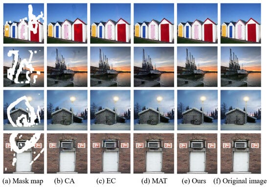 Figure 8 shows the restoration results of the proposed model compared to other algorithms on the Places2 dataset. As observed in the figure, the CA algorithm struggles with color consistency, leading to blurring in finer details. Specifically, at the edges of missing regions, there is an unnatural transition between colors and a visible disconnect between the restored area and the original image. Additionally, for scene images, CA results in distorted and unnatural structures, especially in reconstructing textures and semantic information of objects like buildings. It also performs poorly when the missing regions are large, demonstrating limited effectiveness beyond smaller gaps. In contrast, both the EC (EdgeConnect) and the proposed model excel in recovering complex structural information, particularly in maintaining edge consistency around damaged areas. However, EC falls short in terms of image clarity, as seen in the first row of results, where it fails to clearly reconstruct the pink stripes on a door and inaccurately restores the red color of the door. There is a significant improvement in the effect of the MAT method. However, there are still some cases of uneven color. Both EC and the proposed model, however, demonstrate superior color consistency and seamless blending at the edges of the damaged regions. From a subjective visual perspective, the proposed model shows impressive restoration performance on the Places2 dataset, particularly when dealing with irregular masks. This highlights its effectiveness in restoring both texture and structural details in complex scenes.