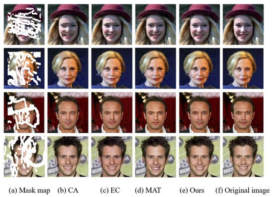 - Li, W.; Lin, Z.; Zhou, K.; Qi, L.; Wang, Y.; Jia, J. Mat: Mask-aware transformer for large hole image inpainting. In Proceedings of the IEEE/CVF Conference on Computer Vision and Pattern Recognition, New Orleans, LA, USA, 18–24 June 2022; pp. 10758–10768. [Google Scholar]