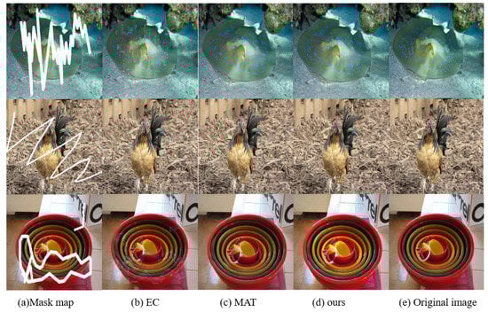 Figure 10 shows the comparison of the restoration effects of our model and other models on the Image-net dataset. Experiments indicate that our method outperforms other methods in terms of the accuracy of image restoration, the degree of detail restoration, and the overall visual effect. In the three images, before restoration, the stingray in the first image, the rooster in the second image, and the cutlery in the third image are obscured by irregular white areas, making it difficult to distinguish the details. The EC method has restored them, but there are obvious shortcomings, such as poor restoration of the stingray pattern, rooster feathers, and cutlery pattern. The MAT method has improved somewhat, but it still cannot restore the real appearance completely, such as the texture of the skin of the stingray, the luster of the rooster feathers, and the color details of the cutlery are not sufficiently fine. The details of the skin texture of the stingray, the shine of the rooster’s feathers and the color of the tableware are not fine enough. In contrast, our method not only accurately restores the clear outlines, delicate textures and vivid colors of the subject, but also perfectly renders its real texture, and the restored image is almost the same as the original one.