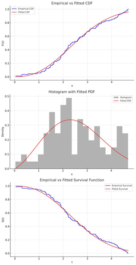 ) among all compared models. These metrics collectively indicate a better balance between model fit and complexity, supporting the conclusion that the NWPD provides a superior representation of the observed data compared to the Weibull, log-logistic, and exponential alternatives. This highlights the flexibility of the NWPD in capturing the underlying failure behavior in the presence of censoring. Supporting plots, including the empirical vs. fitted CDF, histogram with fitted PDF and empirical vs. fitted survival function shown in