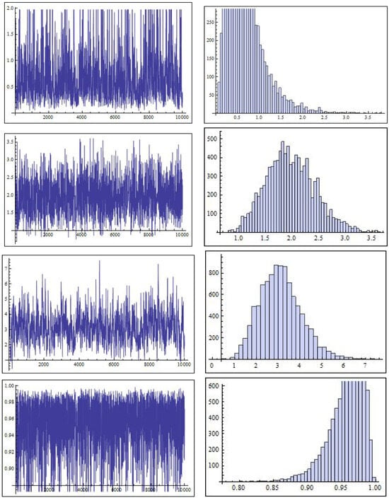 Note: In the implementation of the MCMC algorithm, the initial values for the parameters were set to their corresponding MLEs. This initialization strategy is commonly adopted in Bayesian computation because MLEs often lie near the mode of the posterior distribution, especially under moderately informative priors. Starting the Markov chains from these values helps accelerate convergence, reduce the required burn-in period, and improve sampling efficiency. This approach is particularly useful when the posterior is unimodal and relatively symmetric, as is the case in our model under the chosen prior settings.