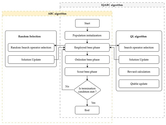In this paper, four distinct ABC-based optimization approaches are proposed. By integrating surrogate modeling, these approaches approximate the fitness landscape, enabling rapid estimations of the fitness function and supporting extensive investigation of the solution space while significantly reducing reliance on exact evaluations. The foundation of our proposed approaches relies primarily on our previous studies, namely the ABC algorithm [31] and its enhanced variant, the Integrated Q-Learning-based ABC (IQABC) algorithm [35], illustrated in Figure 1. The ABC algorithm is an iterative search process that begins with an initialized population of solutions. Then, it proceeds through three main phases: (i) the employed bee phase, where the neighborhood of current solutions isexploited using randomly selected perturbation operators; (ii) the onlooker bee phase, where solutions are evaluated based on a fitness-based selection process to exploit promising areas of the search space; and (iii) the scout bee phase, which maintains diversity by replacing poor solutions with randomly generated ones. In the ABC framework, the employed and onlooker bee phases are the main drivers of exploitation, focusing on intensifying the search around high-quality solutions through neighborhood exploitation and selection mechanisms. In contrast, the scout bee phase promotes exploration by introducing new random solutions into the population, helping to escape local optima and increase search diversity [52,53] With the aim to ensure more adaptive exploitation of the search space, the IQABC algorithm [35] enhanced our standard ABC by incorporating a Q-learning strategy to guide the exploitation of the employed bees’ neighborhood, replacing its original random mechanism.