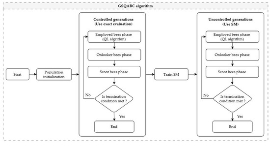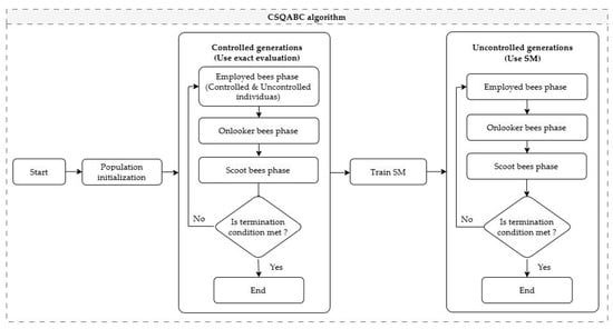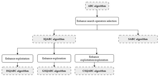 The first proposed surrogate-based approach, namely the Surrogate-Assisted ABC (SABC) algorithm, represents an advanced variant of the ABC algorithm designed to optimize search operator selection. It introduces systematic exploitation of the neighborhood by comprehensively covering the pool of search operators. The surrogate model is leveraged to approximate fitness evaluations of offspring, enabling efficient operator selection and improved exploitation of candidate solutions. On the other hand, the Individual-based Surrogate-Assisted ABC (ISQABC), Generation-based Surrogate-Assisted ABC (GSQABC), and Combined-based Surrogate-Assisted ABC (CSQABC) algorithms extend the IQABC algorithm to address both local exploitation and global exploration challenges. The global architecture and hierarchical organization of the proposed surrogate-based approaches is depicted in Figure 2.