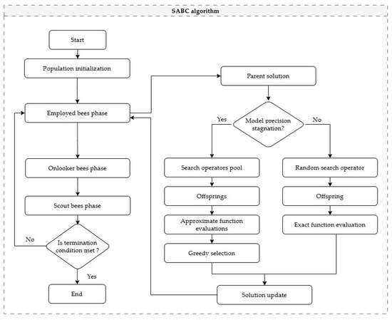 - The Surrogate-Assisted ABC (SABC) focused on enhancing the search operator selection mechanism, enabling a systematic application of the operator pool. Surrogate models were employed to efficiently evaluate the offspring, helping guide the search toward promising areas of the solution space.