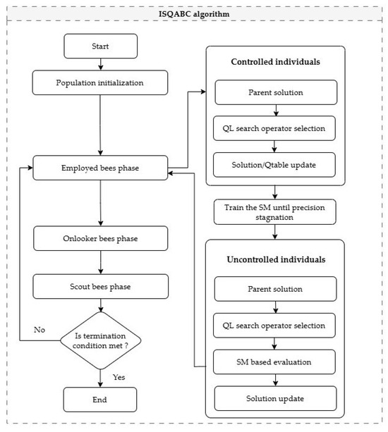 The Individual-based Surrogate-Assisted Q-learning ABC (ISQABC) algorithm is designed to significantly boost the exploitation capabilities of the baseline IQABC algorithm [35] by leveraging a larger population size and integrating a Kriging model for efficient fitness approximation. One of the key challenges in surrogate-assisted optimization is avoiding premature convergence to false optima while maintaining computational efficiency [13,14]. To address this, ISQABC incorporates individual-based evolution control, wherein a carefully selected portion of the population undergoes exact fitness evaluations. Deciding which individuals to control is a critical open problem in the field [3], as improper selection may lead to suboptimal solutions. In ISQABC, we employ a strategy that prioritizes exact evaluations for the best-performing individuals—which are most likely to lead to optimal solutions—while approximating less promising individuals using the surrogate model. This approach strikes a balance between enhancing solution quality and reducing the computational burden, thereby improving the overall efficiency of the algorithm.
