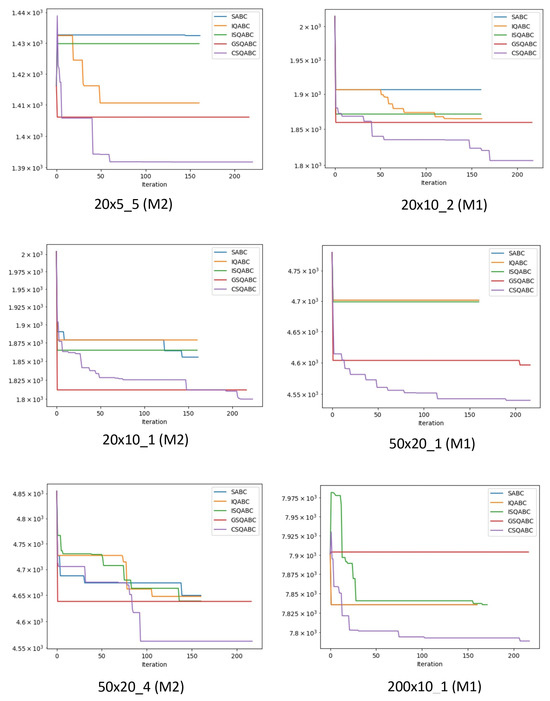 The frequency (W) at which each algorithm identified the best solution provides additional insights into their comparative behavior. While ISQABC frequently obtains the best solutions across a range of instances, including both small-scale (20 × 20) and large-scale problems, e.g., 100 × 20, 200 × 10 (M1), 200 × 20 (M1), other algorithms also excel in specific scenarios. For example, CSQABC performs well in both small- and large-scale problems, including 20 × 10, 50 × 20, and 200 × 20 (M2). GSQABC shows strength in large-scale problems involving complex maintenance conditions, e.g., 100 × 5 (M2), 200 × 10 (M2), while SABC achieves strong results on medium-scale problems (50 × 5). This variation reflects the specialized strengths of each strategy, aligning with their respective focus on exploitation, exploration, or balance. The overall performance parity among the algorithms, confirmed by statistical tests, underscores the complexity of designing a universally superior surrogate-assisted approach for PFSP and highlights the necessity of tailoring algorithmic strategies to instance characteristics.