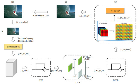 where is the input low-resolution image, denotes the network, and , , , and represent the function of FEB, DCB, DFEB, and RB, respectively.